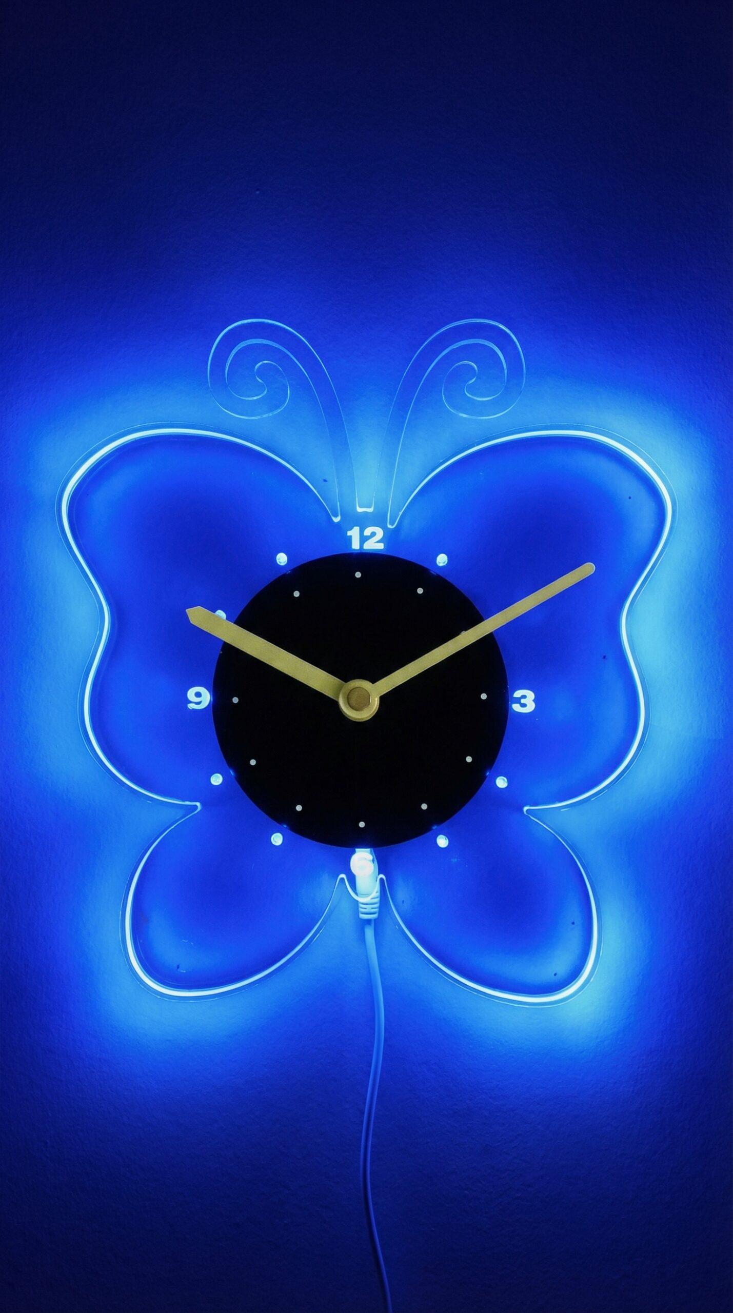 Shaped like a delicate butterfly in flight, the clock features smooth, flowing contours outlined with vibrant blue LED illumination. The glowing wings create a halo effect against the wall, casting a calming, ambient light that enhances the atmosphere of bedrooms, living spaces, nurseries, or creative studios. Subtle decorative antennae extend upward, adding an extra layer of playful detail to the silhouette.