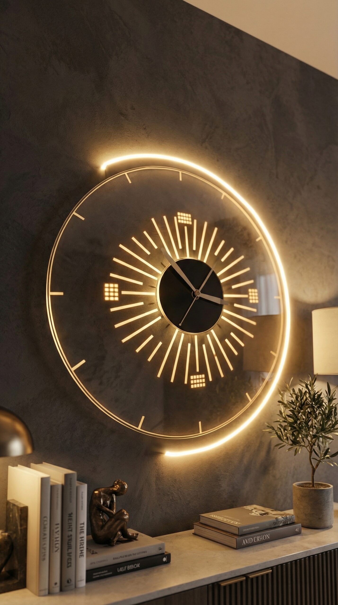 A clean circular silhouette with illuminated numbers and a glowing LED outline for a high-end aesthetic.